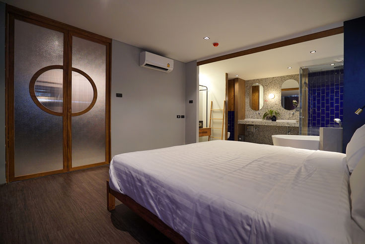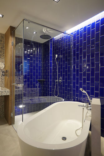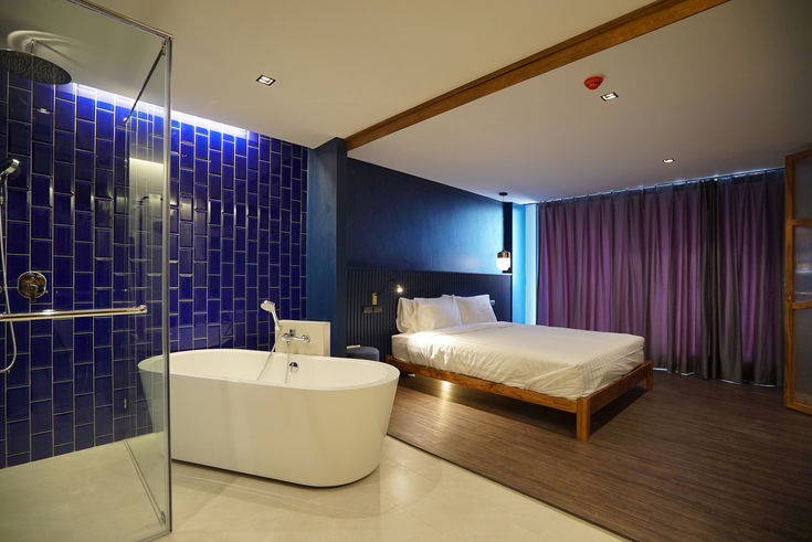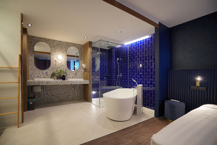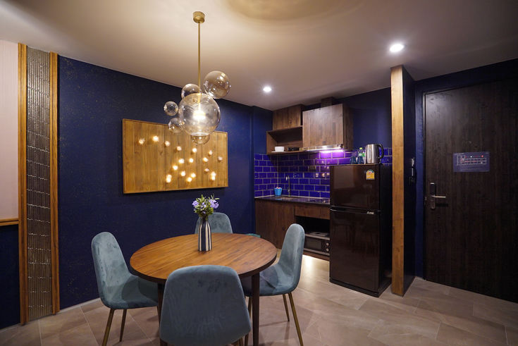 Concept: Having an image of a clear night sky with millions of glittering stars in mind, we decorated this room with midnight blue paint, a touch of shiny finishing and pale pink color representing the color of galaxy faraway.