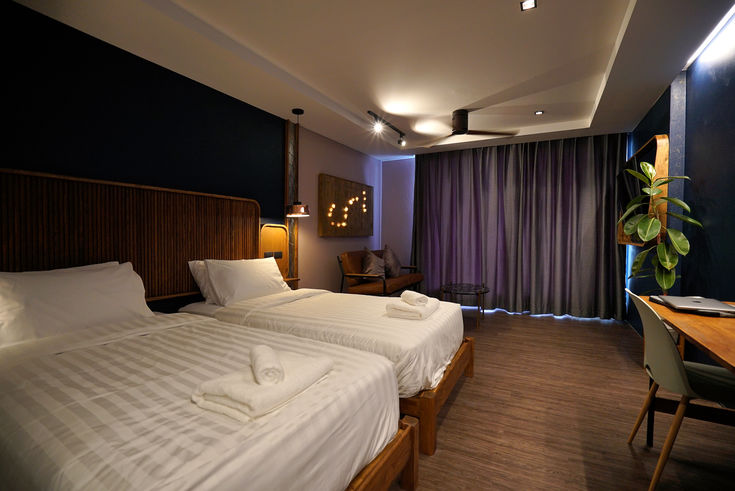 Concept: Just picture the universe full of stars, how will you feel? The answer can be various. Among them, peacefulness will certainly cross your mind. We decorate the room with simple material and midnight blue color to accentuate a peaceful ambience. Staying with us mean starting your everyday with a peaceful state of mind
